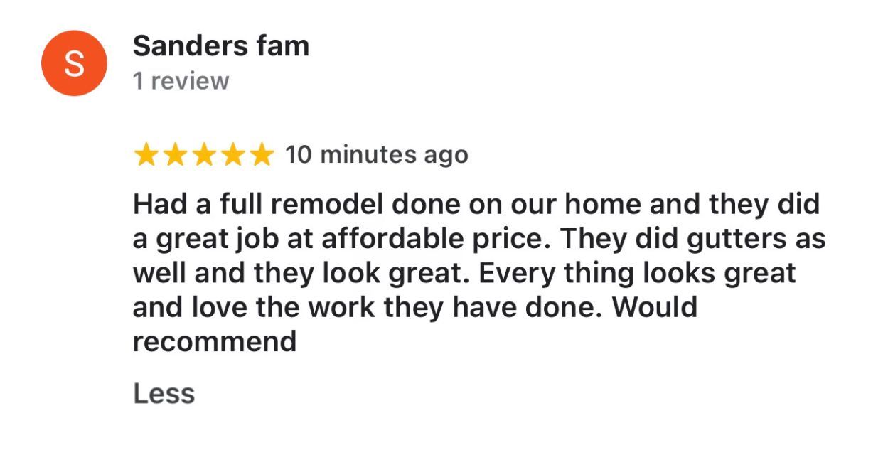 Had a full remodel done on our home and they did a great job at an affordable price. They did gutters as well and they look great. Everything looks great and love the work they have done. Would recommend.